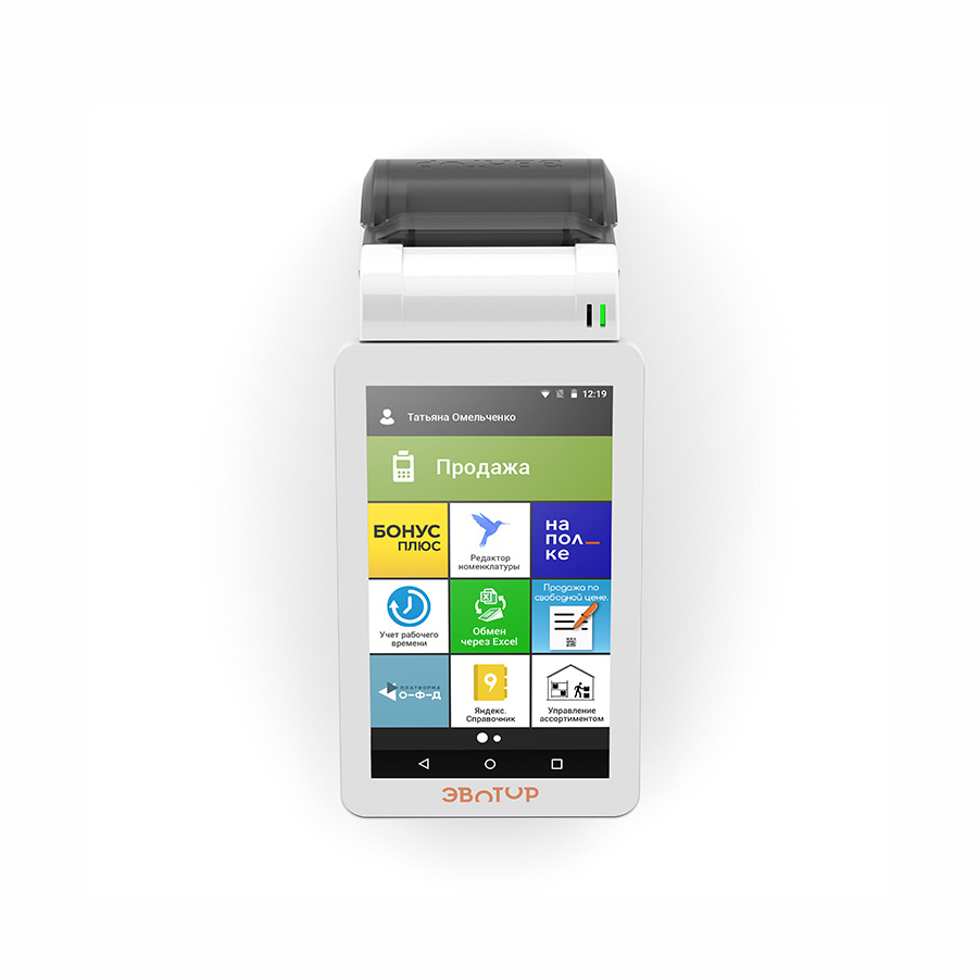 «Эвотор» — это компактная онлайн-касса с неограниченными возможностями. Всё в одном маленьком корпусе: компьютер, фискальный накопитель, принтер чеков. Эвотор можно научить всему, что захотите — просто установите нужное приложение.